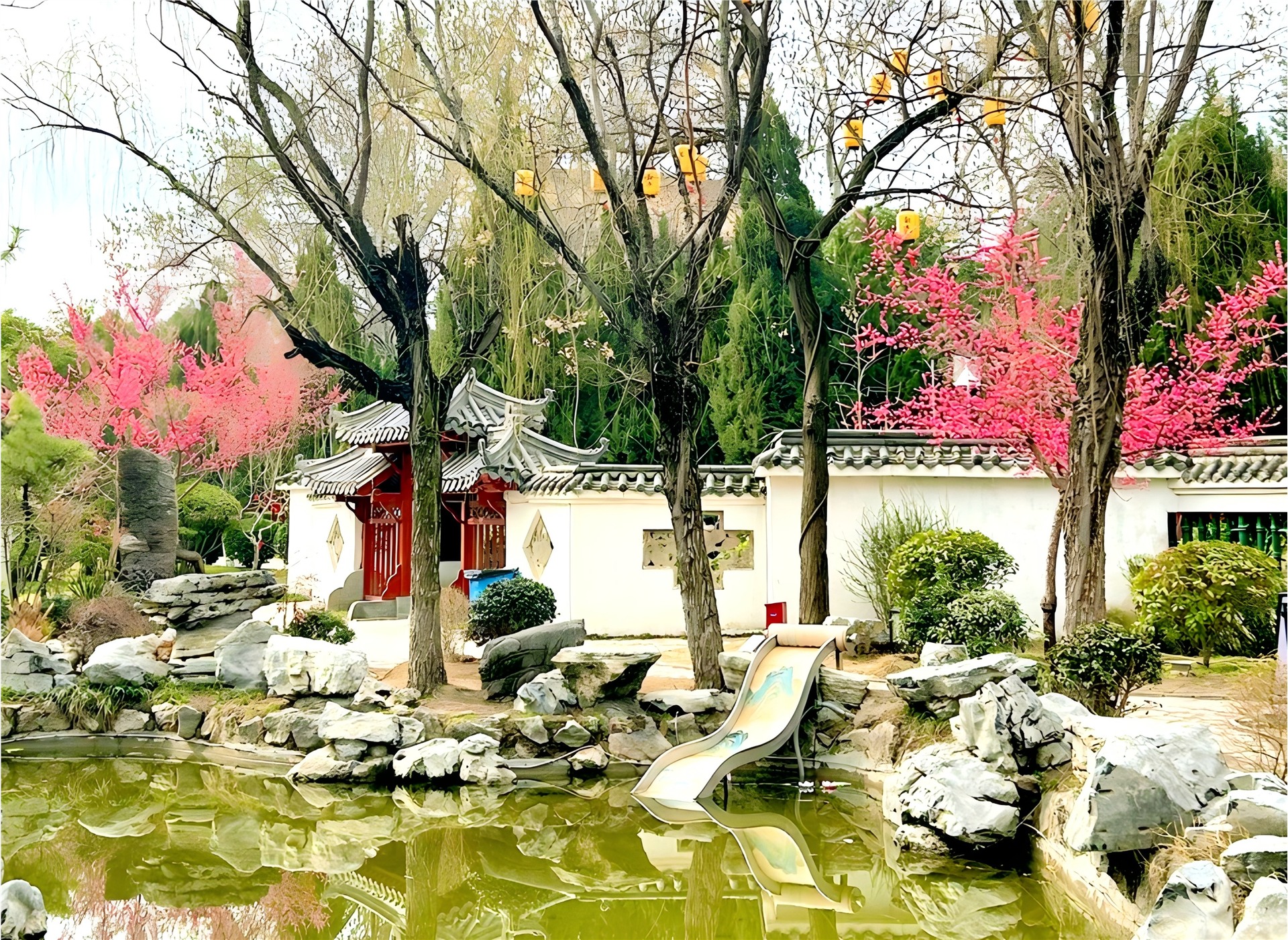 不只是湖面,岸上的每一处细节尽显匠心。新修缮的廊亭古色古香,飞檐翘角在绿树掩映下更显韵味。沿湖步道平坦开阔,防腐木铺就的亲水平台延伸至水边,三三两两的游人凭栏而坐,沐浴暖阳,惬意自在。